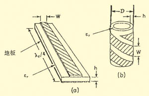 把一體化電視機(jī)視為一種計(jì)算機(jī)以后,只要把全方位螺旋微帶貼片天線直接插入數(shù)字電視機(jī)就能收看電視節(jié)目,在移動(dòng)中接收數(shù)字電視,因?yàn)樾盘?hào)隨地理位置而變化,信道特性作動(dòng)態(tài)變化,這就要求天線對(duì)不同信道的動(dòng)態(tài)特性變化的穩(wěn)定可靠性做出實(shí)時(shí)反映,在移動(dòng)中天線需在全方位范圍內(nèi)保持一定的帶寬和增益。為此我們?cè)O(shè)計(jì)出一種全方位圓柱體螺旋微帶貼片天線,它把1/4波長的微帶諧振器呈螺旋狀地繞在具有一定厚度(h)的空心圓柱體上,其微帶貼片與地板構(gòu)成同軸圓柱體,體積比較小,可以和任何載體共形(例如汽車),同時(shí)也能設(shè)計(jì)成任何規(guī)格(例如:50Ω,75Ω)的帶線與同軸聯(lián)結(jié)器聯(lián)結(jié),不需要匹配網(wǎng)絡(luò),且空芯內(nèi)部可以安裝有源電子器件。圖1就是1/4波長全方位微帶螺旋貼片天線的示意圖,(a)是1/4波長微帶諧振器,(b)是1/4波長全方位微帶螺旋貼片天線的示意圖。
