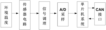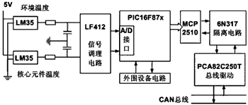 本節點的核心MCU是PIC16F87x,是Microchip公司推出的低功耗8位單片機。PIC16F87x擁有精簡指令集,執行速度為200ns。CAN控制器采用Microchip公司的MCP2510,總線驅動器采用PCA82C250,總線隔離電路采用光耦6N317,信號調理電路采用LF412。溫度監測模塊的硬件結構如圖2所示。