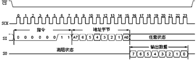 在讀操作開始時,CS引腳將被置為低電平。隨后讀指令和8位地址碼(A7~A0)將被依次送入MCP2510。在接收到讀指令和地址碼之后,MCP2510指定地址寄存器中的數據將被移出通過SO引腳進行發送。每一數據字節移出后,器件內部的地址指針將自動加一以指向下一地址。因此可以對下一個連續地址寄存器進行讀操作。通過該方法可以順序讀取任意一個連續地址寄存器中的數據。通過拉高CS引腳電平可以結束讀操作,如圖6所示。