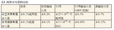 通過選擇單片襯底上的高精度薄膜分壓器,設計人員可以確保分壓器中的電阻元件具有非常相似的電氣特性,并在溫度和時間變化時實現很好的跟蹤。在公用襯底上的材料和處理過程的相似性確保了分壓器能夠在所有比值和環境下更為穩定,且性能更好。