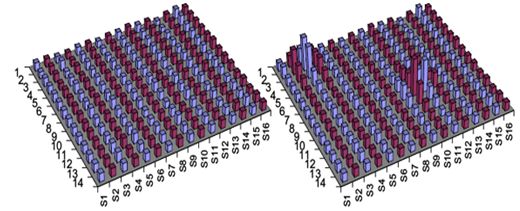 圖4為AD7142 CDC和MAX IIZ CPLD相結合后的2D電容測量結果,顯示了16條走線,即,對x軸進行了16次劃分。左側是基線電容測量,而右側是兩個手指觸摸傳感器后的結果。圖中藍色和紅色采樣行表示哪一SRC走線被激活。