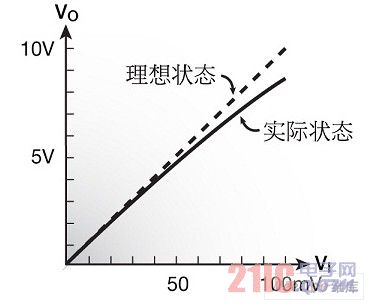 通常k>2,故R2>R1。這表明,在電阻器R2中的功耗和溫升總會(huì)超過(guò)在電阻器R1中的功耗和溫升。即使兩個(gè)電阻器均具有相同的TCR(理想情況),該放大器的增益也將變化,這是因?yàn)镽2/R1比率將取決于輸出電壓VO。因而,聲音信號(hào)的典型尖峰和脈沖可能造成放大器增益的瞬態(tài)變化。其結(jié)果是輸入電壓VI和輸出電壓VO之間的非線性依賴(圖4)。這個(gè)現(xiàn)象稱作溫度引起的放大器的非線性。其原因是電阻器的自熱,其定量的特點(diǎn)是電阻功率系數(shù)(PCR)。減小電阻功率系數(shù)(PCR)的方法是選擇具有最小絕對(duì)TCR值的R1和R2電阻器。