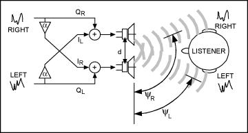當(dāng)兩個揚聲器的間距逐漸縮小時,這種時延逐漸縮小,直到最后兩個揚聲器聽起來如同一個揚聲器的效果。這種串?dāng)_會使人腦“意識”到兩個音源距離非常近。為了從緊湊的音源間距獲得相隔較遠(yuǎn)的音源效果,必須消除耳間串?dāng)_。在每個揚聲器中加入抵消另一個揚聲器聲音的信號,在音源前端消除聽覺串?dāng)_。這種串?dāng)_的消除使聽者感覺聲音發(fā)自相隔較遠(yuǎn)的音源信號3。