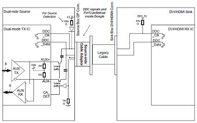 對于DDC信號,雙模源端設備必須隔離AUXCH信號線上的耦合電容和DDC信號線。圖4給出了信號隔離的方法。