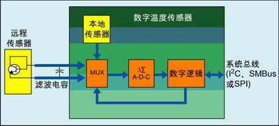 溫度數據變為可用所需的時間稱為轉換速率。該速率由器件內部振蕩器和A/D分辨率決定,一般低于100Hz或長于10ms。轉換速率越快,溫度數據可檢索的速度就越快,同時溫度傳感器消耗的功率也就越大。由于存在自加熱效應,轉換速率通常較低。圖1顯示了一個遠程溫度傳感器和/或本地溫度傳感器的簡化框圖。