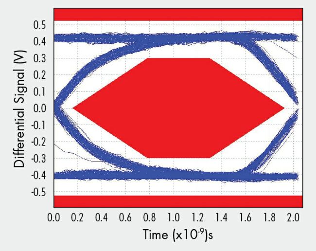 對于大多數集成電路而言,高速和低功耗一般是一對相互矛盾的特性。能夠兩者兼具的解決方案常常需要降低電壓,并使用精細的幾何工藝尺寸;然而,USB規范要求的是高電壓信號。在性能穩健的手機設計中,D+和D-信號能夠承受至5V VBUS信號線的短路,故限制了低電壓解決方案。不過,最近推出的低功耗電荷泵USB開關解決了這個問題,并滿足嚴苛的USB發射眼圖要求,如圖3所示。事實上,無需對架構或所選器件做任何修改,大多數這類設計的工作速率就能夠達到高速USB數據速率(> 1 Gbps)的兩倍以上。