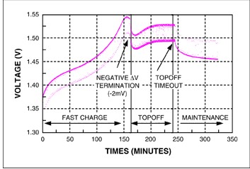 通常采用恒流源對NiMH電池充電。當達到充滿狀態(tài)時,會發(fā)生放熱化學(xué)反應(yīng),并導(dǎo)致電池溫度上升,電池端電壓降低。可檢測電池溫度上升速率或者負向電壓變化率,并用來終止充電。這些充電終止方法分別稱為dT/dt和-ΔV。充電速率非常低時,dT/dt和-ΔV不太明顯,很難精確檢測到。電池開始進入過充狀態(tài)時,dT/dt和-ΔV響應(yīng)開始顯現(xiàn)。此時如果繼續(xù)充電,將損壞電池。