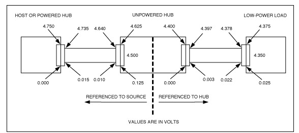 當USB端口帶有一個總線供電的USB集線器,集線器上接了低功耗設(shè)備時,USB口上允許的直流電壓跌落如圖1所示。大功率負載與總線供電的集線器連接時,電壓跌落將超過圖1給出的指標,并會引起總線過載。