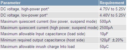 在符合USB 2.0規(guī)范的主機中,大功率端口的上游端具有120uF、低ESR電容。所連接的USB設(shè)備的輸入電容限制在10?F以內(nèi),在最初的負載連接階段,允許負載從主機(或自供電集線器)吸取的最大電荷數(shù)為50?C。這樣一來,當新設(shè)備連接至USB端口時,上游端口的瞬態(tài)電壓跌落小于0.5V。如果負載正常工作時需要更大的輸入電容,則必須提供浪涌電流限制器,以保證對更大的電容充電時電流不會超過100mA。