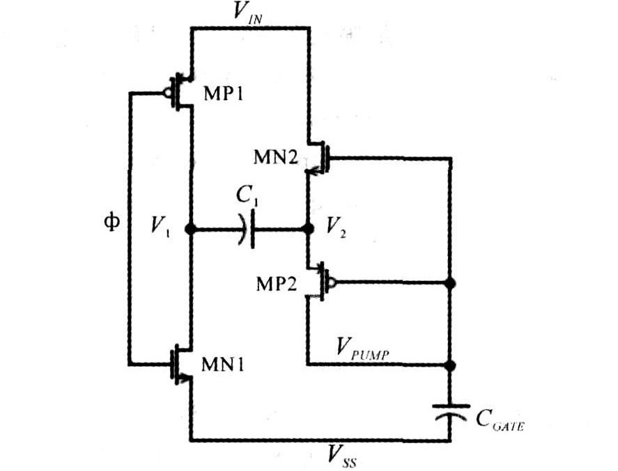 圖2為一種自舉型(SelfBoost)電荷泵的電路原理圖。圖中,為時(shí)鐘信號(hào),控制電荷泵工作。初始階段電容,C1和功率管柵電容CGATE上的電荷均為零。當(dāng)為低電平時(shí),MP1導(dǎo)通,為C1充電,V1電位升至電源電位,V2電位增加,MP2管導(dǎo)通。假設(shè)柵電容遠(yuǎn)大于電容C1,V2上的電荷全部轉(zhuǎn)移到柵電容CGATE上。當(dāng)為高電平時(shí),MN1導(dǎo)通,為C1左極板放電,V1電位下降至地電位,V2電位下降,MP2管截止,MN2管導(dǎo)通,給電容C1右極板充電至VIN。在的下個(gè)低電平時(shí),V1電位升至電源電位,V2電位增加至2VIN,MP2管導(dǎo)通,VPUMP電位升至2VIN-VT。