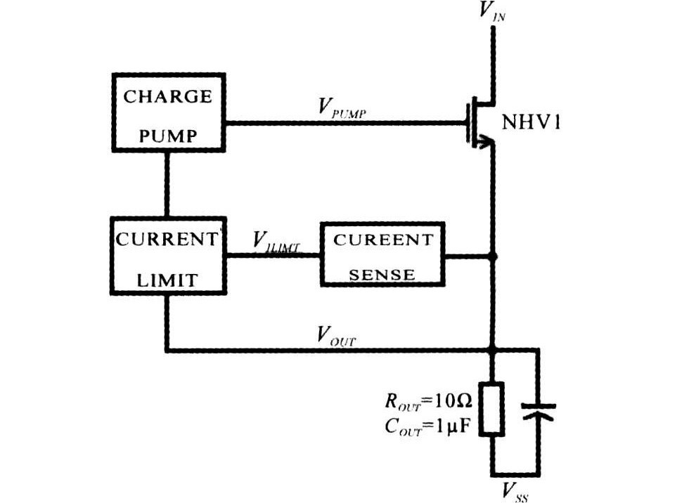 圖1為USB電源開關(guān)的整體設(shè)計(jì)。其中,VIN為電源輸入,VOUT為USB的輸出。在負(fù)載正常的情況下,由電荷泵產(chǎn)生足夠高的柵驅(qū)動(dòng)電壓,使NHV1工作在深線性區(qū),以降低從輸入電源(VIN)到負(fù)載電壓(VOUT)的導(dǎo)通損耗。當(dāng)功率管電流高于1A時(shí),Currentsense輸出高電平給過(guò)流保護(hù)電路(Currentlimit);過(guò)流保護(hù)電路通過(guò)反饋負(fù)載電壓給電荷泵,調(diào)節(jié)電荷泵輸出(VPUMP),從而使功率管的工作狀態(tài)由線性區(qū)變?yōu)轱柡蛥^(qū),限制功率管電流,達(dá)到保護(hù)功率管的目的。當(dāng)負(fù)載恢復(fù)正常后,Currentsense輸出低電平,電荷泵正常工作。