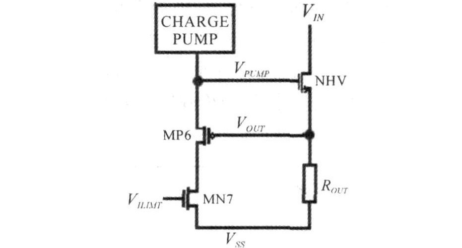 當(dāng)出現(xiàn)過(guò)載和短路故障時(shí),負(fù)載電流達(dá)到數(shù)安培,需要精確的限流電路為功率管和輸入電源提供保護(hù)。對(duì)于MOS器件,只有工作在飽和區(qū)時(shí)的電流容易控制。限流就是通過(guò)反饋負(fù)載電壓,調(diào)節(jié)電荷泵輸出電壓來(lái)實(shí)現(xiàn)的。圖4是限流電路的原理圖。