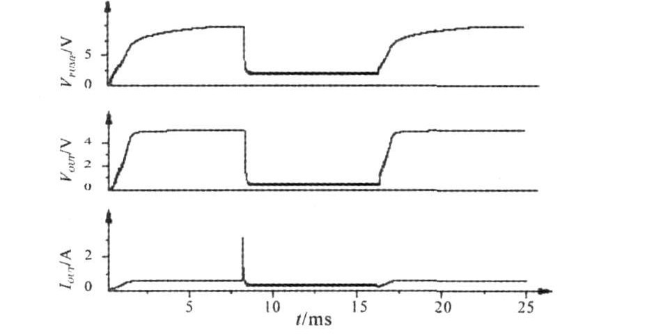 圖6 USB開關(guān)在啟動(dòng)、限流和恢復(fù)正常過(guò)程中,電荷泵輸出電壓、負(fù)載輸出電壓和功率管電流的仿真波形
