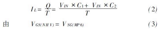 當(dāng)負(fù)載電流超過(guò)1A時(shí),電流限信號(hào)(VLIMIT)為高電平,MN7導(dǎo)通,柵電荷經(jīng)MP6流向地,柵電壓減小,功率管工作在飽和區(qū)。C1、C2為電荷泵電容值,在一個(gè)時(shí)鐘周期T內(nèi),由電荷泵充入的柵電荷為: