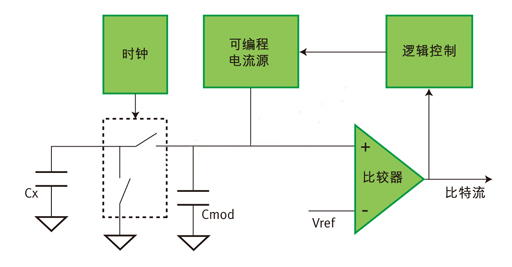 時鐘:本文提到的電容式感應系統是基于開關電容原理的。相反,物理上的傳感器電容通過在連續周期內給傳感器電容充放電模擬成了電阻。模擬電阻和傳感器電容值成正比,可以用電流源和一個數模轉換器來計算傳感器電容實際值。
