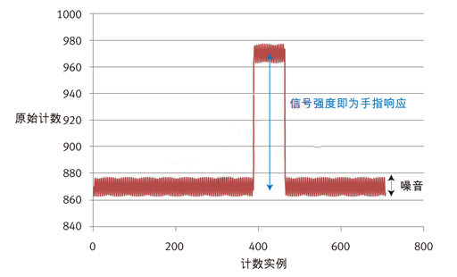 圖5:原始傳感器數據由手指響應和噪音構成。手指響應,也稱為信號強度,是當手指放在傳感器上時通過感應系統可以看到的原始計數的差別