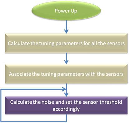 噪聲是一個隨機時間函數,由其自身性質決定。工作一個小時后和剛開機時是不一樣的,下一個時刻又不相同。因此,手指檢測的閾值應基于傳感器原始計數檢測到的噪聲來調整。圖8顯示了自調試系統如何基于系統噪聲調整手指閾值。