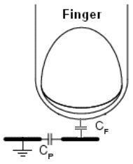 要感應到手指的存在,電容式感應系統首先要知道沒有手指時的傳感器電容(見圖2a),也稱為寄生電容(Cp)。當手指接近或接觸傳感器時(見圖2b),傳感器電容值將會變化,這就產生了和Cp并聯的另一個電容,稱為手指電容(Cf)。有手指存在時,總傳感器電容(Cx)如方程1所示: