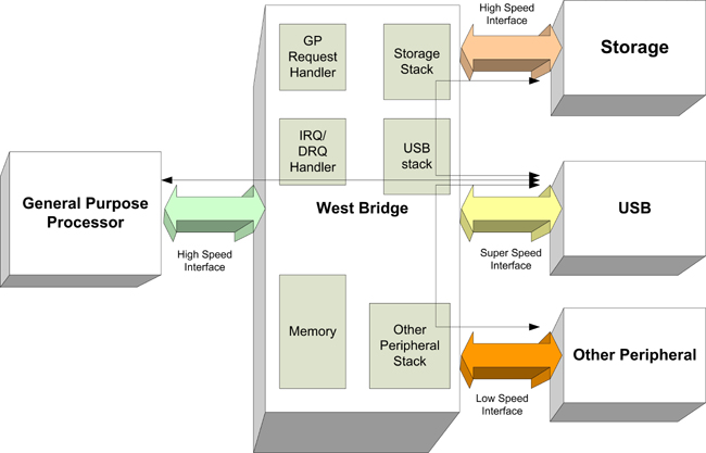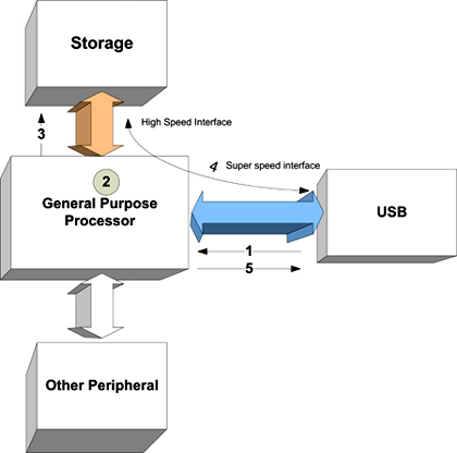 在一個(gè)普通的場(chǎng)景中,在device端,處理器直接連接到USB、存儲(chǔ)器和外設(shè)。記住這種結(jié)構(gòu),由High-Speed過(guò)渡到SuperSpeed,處理器的影響可以概括如下: