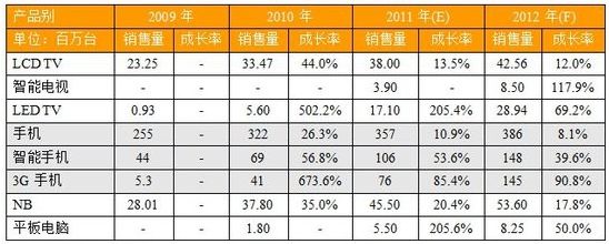 2012年中國大陸主要消費電子產品銷售量預估