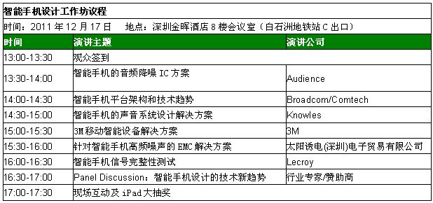 HTC、SAMSUNG、LG、SHARP、AT&T、SK Telecom、PANTECH、DoCoMo 等手機(jī)設(shè)計(jì)領(lǐng)軍廠商在智能市場(chǎng)領(lǐng)域的競(jìng)爭(zhēng)非常激烈,他們都用到哪些技術(shù)?由我愛方案網(wǎng)(www.52solution.com)、電子元件技術(shù)網(wǎng)(www.yttele.cn)和China Outlook Consulting主辦的首屆智能手機(jī)設(shè)計(jì)工作坊(Smart Phone Design Workshop)將于2011年12月17日下午在深圳金暉酒店8樓會(huì)議室隆重召開!為您Hold 住 2012 智能趨勢(shì),給力手機(jī)開發(fā)設(shè)計(jì)!