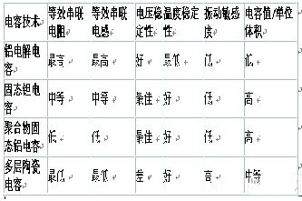 在電壓調(diào)節(jié)器中,以下三大類電容通常用作電壓輸入和輸出旁路電容:多層陶瓷電容、固態(tài)鉭電解電容和鋁電解電容下表對這三類電容進(jìn)行了比較。