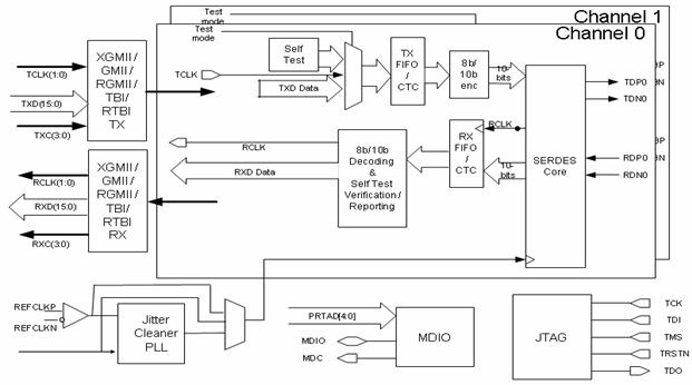 下面詳細介紹了6個功能模塊及其應用特點:并行接口、串行接口、時鐘分布電路、8B/10B編解碼電路、PRBS測試以及相關寄存器訪問控制接口MDIO。