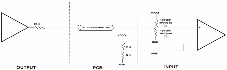并行接口采用單端的HSTL Class1電平接口,遵循EIA/JESD8-6標準電氣指標規格,同時支持1.5V或1.8V的電源電壓。為了提高HSTL高速接口的SI性能,TLK3132并行接收側集成了可寄存器配置的匹配電阻,采用戴維南等效電路匹配方式,等效于加一個匹配電阻到VDDQ/2,同時也可關閉內部的阻抗匹配電路,如圖2所示;并行發送側可通過寄存器配置4種不同的邊沿速率。