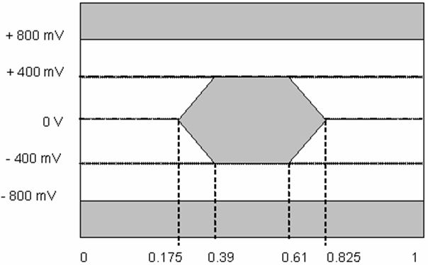 在高速數據鏈路通信中,抖動指標是非常關鍵的,CPRI接口相應推薦了高速串行信號的眼圖和抖動規格。在SERDES發送側,CPRI要求的眼圖模板如圖8所示。