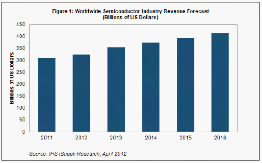 預計2012年半導體營業收入將達到3246億美元,比去年的3114億美元增長4%。與去年1%的增長率相比,今年增長情況有所改善,而且所有信號都顯示,隨著全球經濟趨于穩定,半導體產業將重新站穩腳跟。除非全球市場出現意外的經濟下滑或者半導體產業出現重大失策,否則營業收入未來幾年將繼續上升,到2016年將達到4128億美元左右,如圖1所示。