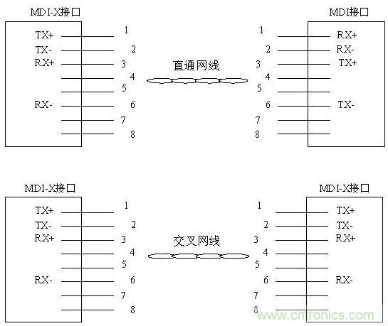 從以上分析可看出,網(wǎng)線連接兩個接口的目的是使兩端TX與RX對接起來,因此,當(dāng)MDI-X接口與MDI接口相連時需使用直通網(wǎng)線,而MDI接口與MDI接口相連或MDI-X接口與MDI-X接口相連時需使用交叉網(wǎng)線。