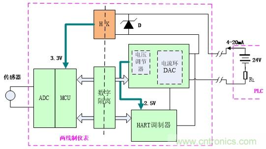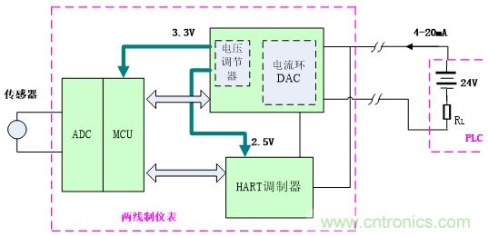 圖一的電路中,傳感器的信號經過ADC轉換成數字信號,再經MCU發送給電流環DAC及HART調制器,形成4-20mA的信號輸出,電流環DAC從PLC輸出的4-20mA總線上取電,經內置的電壓調節器輸出3.3V及2.5V,給MCU及HART調制器提供少量的電源。