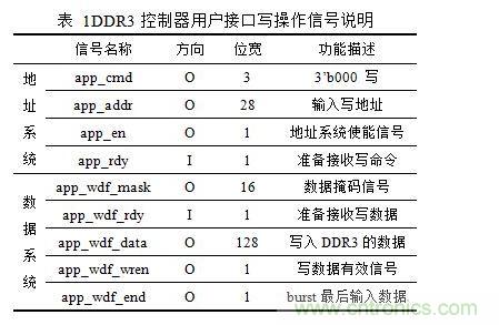 DDR3存儲器控制模塊用戶接口寫操作有兩套系統,一套是地址系統,一套是數據系統。用戶接口寫操作信號說明如表 1所示。