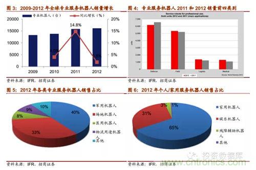 IFR報告預期,從2013年到2016年,全球工業機器人市場將以年均6%的速度增長,中國是這一增長趨勢的領跑者,年均增長率達15%。根據marketsandmarkets的報告,2011年全球服務機器人市場規模為183.9億美元,到2012年增長到207.3億美元,計2012-2017年全球服務機器人市場規模復合增速將達到17.4%,到2017年達到461.8億美元。對于專業服務機器,IFR預測2013-2016年估計有94800臺專業服務機器人會得到安裝使用,銷售額達171億美元。其中軍用機器人銷量約達28000臺;場地機器人中的擠奶機器人銷量估計為24500臺。兩者占總專業服務機器人銷量55%。