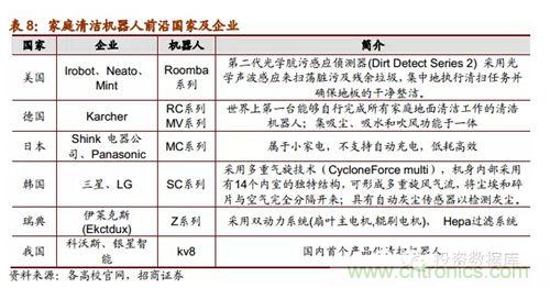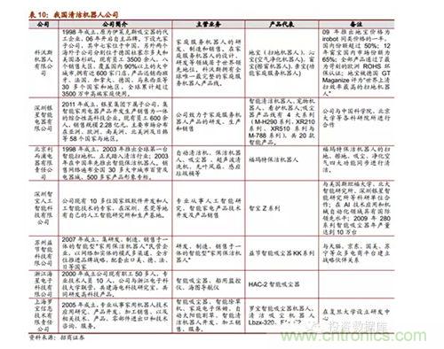 根據中國品牌網統計公布的2013年十大掃地機器人品牌排行榜,我國國產掃地機器人有6家上榜。目前為止,我國已經有一部分表現優良的企業涉足家用清潔機器人的開發和生產,都和國內高校研發機構有所合作,做到研產結合。當前機器人行業發展的宏觀前景良好,市場潛力巨大,目前我國會在未來出現一批在細分行業技術領先表現良好的潛力企業。