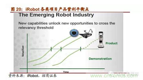 iRobot的產品戰略布局以家居清潔機器人為主。家居清潔機器人所需投入成本較其它產品低,最早成為現金牛,為新研發的更高級產品提供資金支持。目前遠程視頻機器人成功研制,開始進入營銷階段。