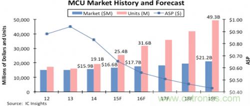 盡管將來的ASP還會繼續下滑,IC Insights預測明年的微控制器收會增長7%至177億美元,全球的出貨量會增長25%至316億顆。