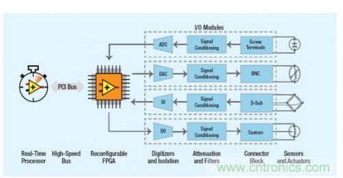 圖2 - NI LabVIEW的可重配置I/O(RIO) 架構基于四大組件之上:如處理器、可重配置FPGA、模塊化I/O硬件和圖形設計軟件。