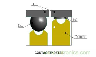 頂針式的適配座如圖5所示,黃色部分是頂針,黑色部分分別是焊球管腳IC和焊盤式管腳IC,不管是焊球還是焊盤式IC,其帶有彈簧能上下活動的頂針都能良好接觸。