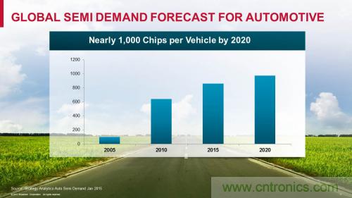 圖 1:汽車半導體正蓬勃發展,據分析人士預測,到 20201 年每輛汽車使用的芯片數量將接近1,000 枚,而 2005 年還不足 100 枚。