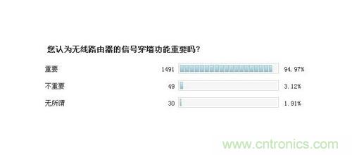 隨著Wi-Fi終端的大量普及,人們對于無線路由器的需求也越來越高,不過在此前展開的有獎調查活動中,從收集到的大約1500份反饋里,有高達94.97%的參與者認為無線路由器的信號穿墻功能相當重要??梢娙藗冊谶x擇無線路由器產品時,信號能否穿墻,覆蓋范圍怎么樣,已經成為他們采購時的首要考察因素。