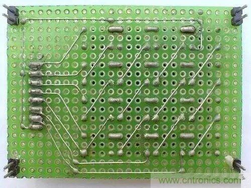 對(duì)于萬(wàn)能板的焊接方法,一般是利用前面提到的細(xì)導(dǎo)線進(jìn)行飛線連接,飛線連接沒(méi)有太大的技巧,但盡量做到水平和豎直走線,整潔清晰如下圖。