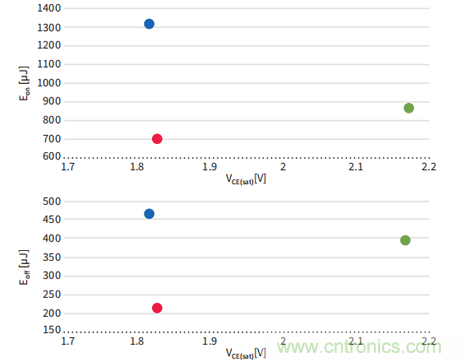 600/650V IGBT 飽和壓降(VCE(sat) ) vs開通損耗(Eon ) & 關斷損耗(Eoff)比較測試條件: TC = 150°C, IC = 15 A, Rg = 25, VGE = 15 V。