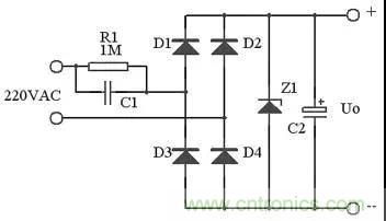 在實際應用中,可以用下圖代替上圖,這里用了Z1正向特性和反向特性,其反向特性(也就是其穩壓特性)來穩定電壓,其正向特性用來在市電負半周給C1提供放電回路。