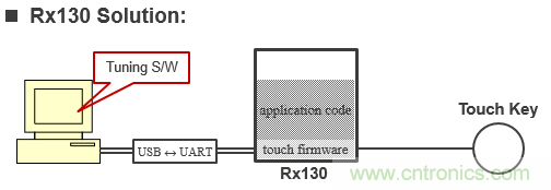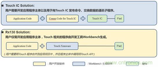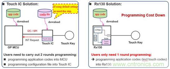 從程序燒寫的成本,比較二者的不同。如圖4所示,如果用戶不使用觸控 IC的缺省參數,而是使用結合具體應用方案優化后的參數,那么需要通過編程器將最新的參數固化到觸控 IC。特別是批量生產時,增加了燒錄觸控 IC的額外成本。而右圖所示的Rx130方案中,僅需要將應用程序燒錄到Rx130中。