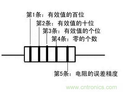 電阻器上用不同顏色的環來表示電阻的標稱阻值,常見的電阻器有四色環電阻和五色環電阻。四色環電阻,一般是碳膜電阻,用三個色環來表示阻值,用一個色環表示誤差。五環電阻一般是金屬膜電阻,精度更高,常用四個色環表示阻值,另一個色環表示誤差。