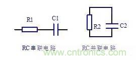 電路中電阻與電容組合在一起的電路稱為RC電路,圖中R1和C1構成了RC串聯電路,R2和C2構成了RC并聯電路。