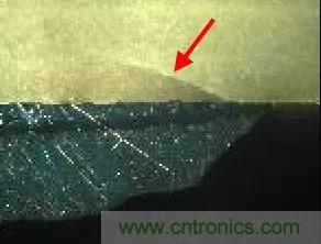 熱沖擊主要發生在波峰焊時,溫度急劇變化,導致電容內部電極間出現裂縫,一般需要通過測量發現,研磨后觀察,通常是較小的裂縫,需要借助放大鏡確認,少數情況下會出現肉眼可見的裂縫。
