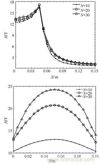 圖9:不同匝數下磁場強度H分布曲線