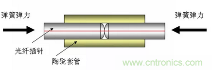 傳統(tǒng)的光纖連接器均為接觸式光纖連接器,其工作原理如下圖所示,通過高精度的插針套管實現(xiàn)光纖的精準對接(MT型插芯是通過兩對高精度導銷導孔實現(xiàn)),通過兩端的彈力實現(xiàn)兩端端面的緊密連接,從而實現(xiàn)光路的可靠連接。